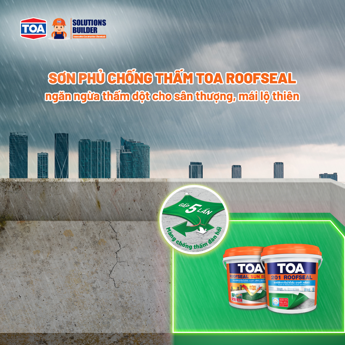 Cặp đôi sản phẩm chống thấm hiệu quả cho mái nhà và sân thượng bê tông là TOA Roofseal (TOA 201 Roofseal & TOA Roofseal Sun Block). Nhờ khả năng chống thấm 100% và độ co dãn gấp 5 lần, TOA Roofseal như lớp ngăn chặn nước thấm qua các vết nứt nhỏ. Bảo vệ toàn bộ kết cấu khỏi tác động khắc nghiệt của thời tiết.