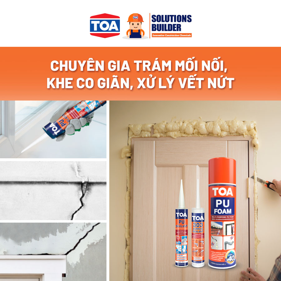 Vậy dùng gì chống thấm dột? Đây là gợi ý bộ ba sản phẩm TOA PU Foam, TOA PU Sealant & TOA 303 Acrylic Sealant - giải pháp hoàn hảo cho việc chống thấm các khe hở quanh cửa sổ và cửa ra vào. Sản phẩm đảm bảo chất lượng về khả năng đàn hồi cao, bám dính tốt và chịu được điều kiện thời tiết khắc nghiệt, ngăn chặn nước mưa len lỏi vào các khe hở nhỏ. Nhà luôn khô ráo và sạch sẽ.