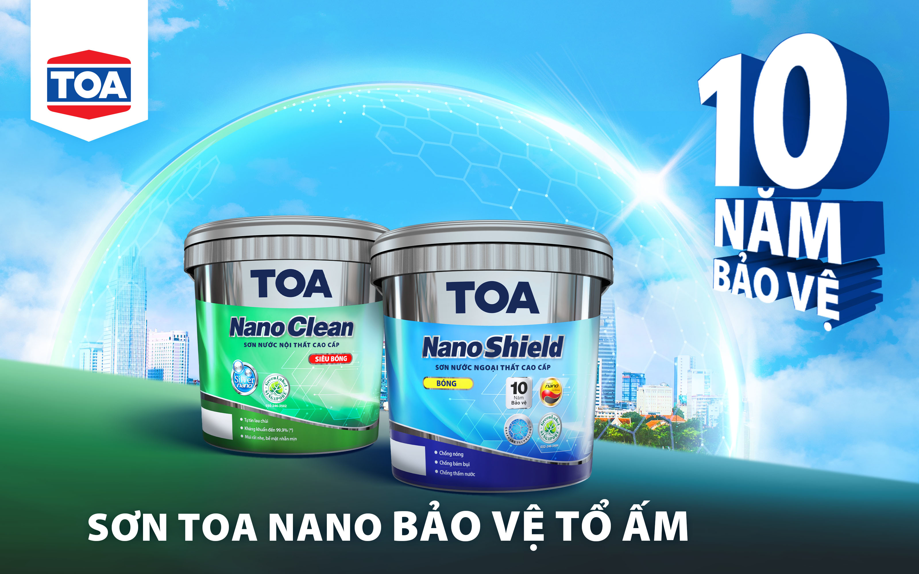 Sau đó, bạn hãy sử dụng 2 lớp sơn ngoại thất có khả năng chống thấm tốt. Với ứng dụng công nghệ Hybrid Nano & Graphene, sơn nước ngoại thất cao cấp TOA NanoShield có khả năng chống thấm nước vượt trội, chống bám bụi, chống tia UV & rêu mốc, bảo vệ ngôi nhà bạn lên đến 10 năm. Đối với tường nội thất, hãy sử dụng 2 lớp sơn nước nội thất cao cấp TOA NanoClean. Với khả năng kháng khuẩn lên đến 99.9%, TOA NanoClean giúp ngăn vết bẩn và vi khuẩn bám vào bề mặt tường nội thất, cho không gian sống luôn sạch sẽ.