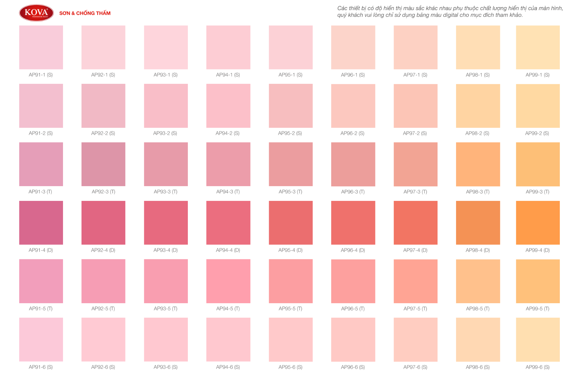 Bảng màu Sơn Nội Thất & Ngoại Thất KOVA mang đến sự lựa chọn đa dạng, từ gam màu tinh tế, trang nhã đến sắc thái hiện đại, cá tính. Sơn có độ bền cao, bám dính tốt, chống bám bẩn, chống thấm và chịu được thời tiết khắc nghiệt, giúp công trình luôn bền đẹp theo thời gian.