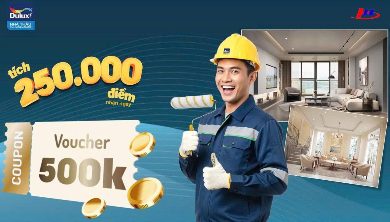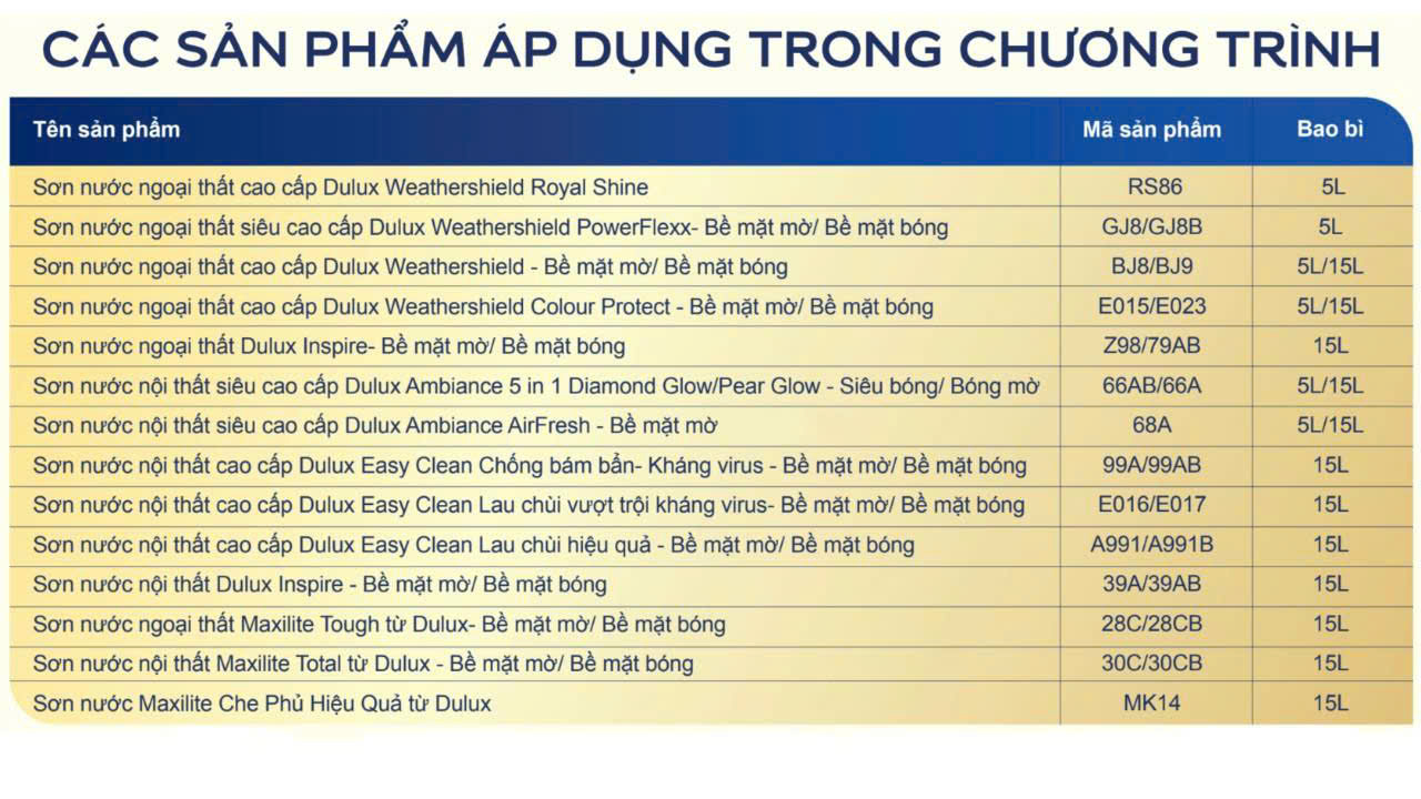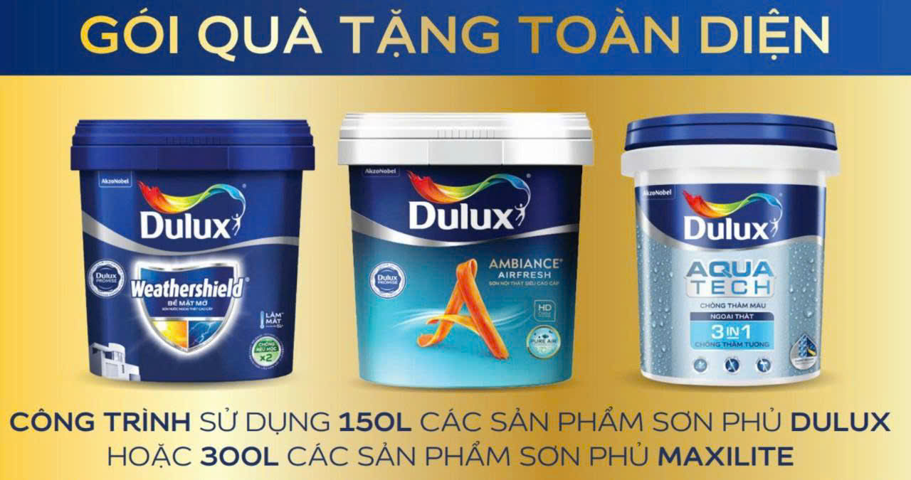 - Công trình sử dụng tối thiểu 150L các sản phẩm sơn phủ Dulux hoặc 300L các sản phẩm sơn phủ Maxilite áp dụng trong chương trình cho mỗi công trình.