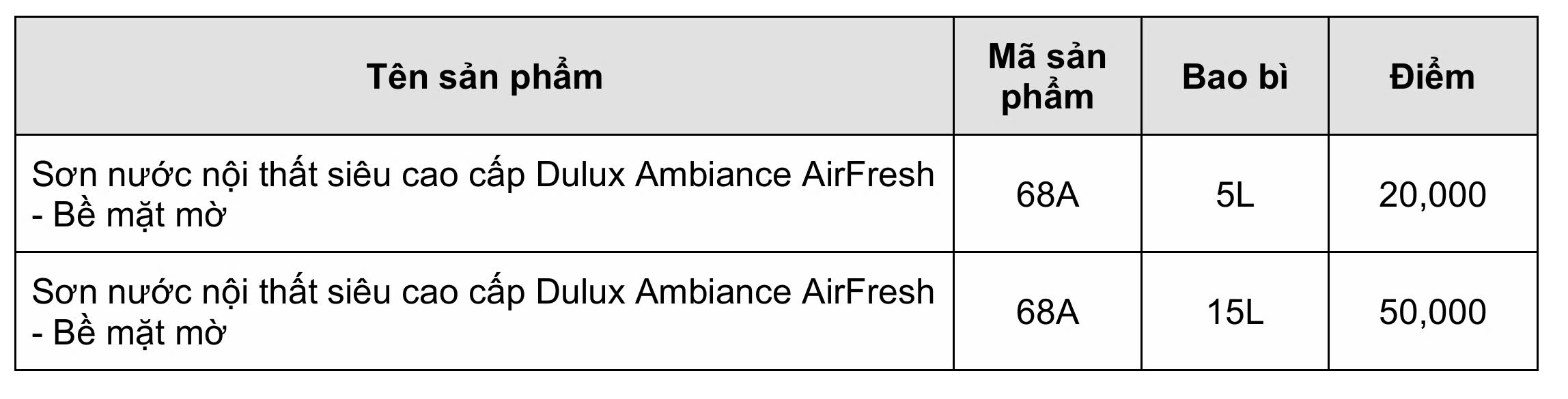 Ưu đãi điểm thưởng dành cho sản phẩm sơn nước nội thất siêu cao cấp Dulux Ambiance AirFresh:
