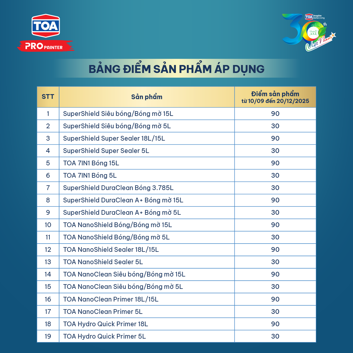 30 Năm - một hành trình trưởng thành và đầy dấu ấn của TOA tại thị trường Việt Nam. Cột mốc để nhìn lại những thành tựu đã đạt được, đồng thời xem đó là động lực để đổi mới, vươn mình trong tương lai. Hòa trong không khí hân hoan của NGÀY KỈ NIỆM 30 NĂM, Sơn TOA Việt Nam mang đến ƯU ĐÃI HẤP DẪN cho các Hội viên của chương trình Nhà thầu Chuyên Nghiệp sơn TOA: 30 năm Vững Vàng, Rộn Ràng Nhân Ba. Kính mời Quý Hội Viên xem thông tin chi tiết dưới đây.